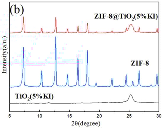 Figure 1b shows the composite material comparison diagram. It can be seen that the XRD pattern of ZIF-8 presents strong diffraction peaks at 7.35°, 10.34°, 12.68°, 14.66°, 16.5° and 18.0°, corresponding to the crystal planes of (011), (002), (112), (022), (013) and (222), respectively. The position of the diffraction peak was consistent with the standard diffraction card [28]. The crystal plane corresponding to the TiO2 (5%KI) diffraction angle (2θ) of 25.21° was an anatase-type (101) crystal plane, as shown in Figure 1b. Due to the different intensities of the ZIF-8@TiO2 (5%KI) peaks, individual diffraction peaks are masked.
