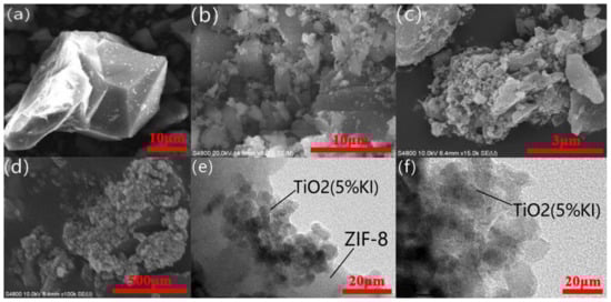 SEM (a) of ZIF-8; SEM (b–d) and TEM (e,f) of ZIF-8@TiO2 (5%KI).