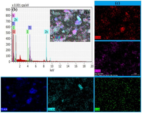 Figure 3a,b show the EDX images of ZIF-8@TiO2 (5%KI). Figure 3c is the mapping of a single element. The bond between Ti and O was verified by XRD detection. The distribution of I was the same as that of Ti, which indicates that I was doped into TiO2 or distributed on the surface of TiO2. In XRD detection, the doping of TiO2 with I led to the change in crystallite size, so I was doped into TiO2 [30]. The distribution of Ti and Zn in the composite material was different, because the distribution of TiO2 (5%KI) in the composite material was not uniform. TiO2 (5%KI) exhibited the agglomeration phenomenon and some ZIF-8 did not cover TiO2 (5%KI). However, the distribution of Ti and Zn was similar at the locations of ZIF-8-coated TiO2 (5%KI).