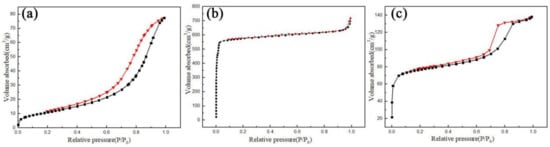 (a) N2-desorption diagram of TiO2 (5%KI), (b) N2-desorption diagram of ZIF-8, (c) N2-desorption diagram of ZIF-8@TiO2 (5%KI).