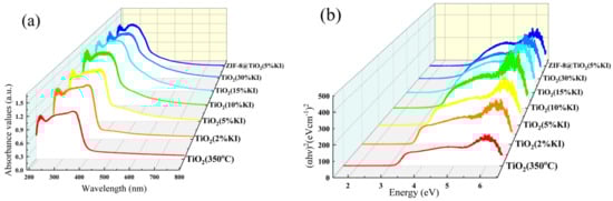 XRD shows that the crystal of TiO2 is of the anatase type. The band gap of anatase-type TiO2 was 3.2 eV when TiO2 was calcined at 350 °C for 5 h. Figure 6a shows the DRS of TiO2 (350 °C), TiO2 (KI) and ZIF-8@TiO2 (5%KI). Figure 6b provides a plot of the band gap width of the above material. The range of the light response changed, and the UV diffuse reflectance spectrum curve had a red or blue shift after the doping of KI. A red shift occurred in TiO2 (5%KI), TiO2 (10%KI), TiO2 (15%KI) and TiO2 (30%KI), which increased the light response range. The blue shift of TiO2 (2%KI) and ZIF-8@TiO2 (5%KI) reduced the light response range. Table 3 shows the band gap widths of samples. As can be seen from Table 3, the band gap widths of TiO2 (5%KI), TiO2 (10%KI), TiO2 (15%KI) and TiO2 (30%KI) decrease in turn, which are all smaller than the band gap of TiO2 (350 °C). The reason is that the doping with I causes defects in the TiO2 crystal, resulting in defective energy levels, reducing the average particle size of the crystal and increasing internal stress, which led to the overlap of electronic wave function [41]. The blue shift of TiO2 (2%KI) and ZIF-8@TiO2 (5%KI) was caused by the quantum size effect of the nanoparticles.