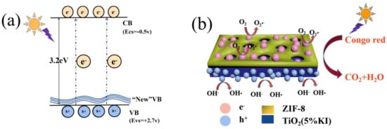 The degradation mechanism of photocatalytic materials is shown in Figure 7. The energy of UV light was greater than the band gap value of anatase TiO2 (3.2 eV). Electrons in the TiO2 valence band (VB) were excited to the conduction band (CB). Photogenic holes had positive potential in the valence band and photogenic electrons had negative potential in the conduction band. Photogenerated electrons combined with oxygen in the solution to form superoxide radicals (O∙), and photogenerated holes combined with OH− to form hydroxyl radicals (OH∙) [42]. O∙ and OH∙ can mineralize Congo red into small molecules to achieve degradation. The doping of I atoms will generate a new valence band in the gap, which is near the valence band, due to the substitution of Ti4+ by I5+ [43], and the covalent bond features of I5s, 5P orbitals and O2p [44]. The new valence band makes it easier for photogenerated electrons to transfer to the conduction band, thus, improving the photocatalytic efficiency. ZIF-8 was coated with TiO2, and the Congo red in the solution was adsorbed to the surface of ZIF-8. O∙ and OH∙ were transferred to the surface of ZIF-8 via the ZIF-8 channel to degrade the adsorbed Congo red.