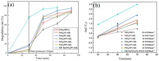 The catalysts used were TiO2 (350 °C), TiO2 (2%KI), TiO2 (5%KI), TiO2 (10%KI), TiO2 (15%KI), TiO2 (30%KI) and ZIF-8@TiO2 (5%KI). The dosage of the catalyst was 20 mg. A concentration of 20 mg/L and a volume of 100 mL of Congo red solution were selected for the photodegradable material. The test process was the same as that given in 2.2.3, and the photocatalytic efficiency was calculated according to Equation (1). It can be seen from Figure 8a that the photocatalytic efficiency first increased and then decreased in TiO2 (350 °C), TiO2 (2%KI), TiO2 (5%KI), TiO2 (10%KI), TiO2 (15%KI) and TiO2 (30%KI). TiO2 (5%KI) had the highest catalytic efficiency. The degradation efficiency of Congo red solution could reach 95.21% after 1 h of UV irradiation. The highest catalytic efficiency found for TiO2 (5%KI) was due to the following reasons: The doping of I causes lattice distortion and produces a Ti-O-I bond in TiO2 [35]. The I atoms replace Ti atoms to generate a shallow potential trap, which inhibits the recombination of the photo-generated electron and hole [45]. Therefore, the photo-generated electron and hole are further separated, and the photocatalytic efficiency is improved [46]. The light response range of TiO2 increased and the phenomenon of red shift occurred after the doping of KI, which improved the utilization rate of ultraviolet light [47].