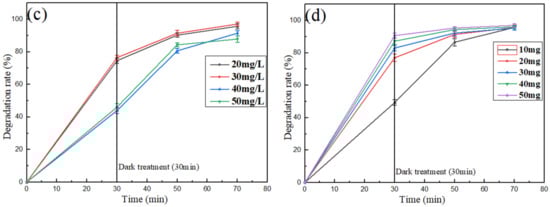 The dosage of the catalyst was 20 mg, the concentration of Congo red solution was 20 mg/L, 30 mg/L, 40 mg/L, and 50 mg/L and the solution volume was 100 mL. Figure 8c shows the effect of the initial concentration of Congo red solution on the catalytic efficiency. The catalytic efficiency first increased and then decreased with the increase in solution concentration. The Congo red solution of 30 mg/L had the highest catalytic efficiency. The low concentration of Congo red solution was insufficient to make full use of the reaction site. The reaction sites were fully utilized, which enhanced the photocatalytic efficiency when the concentration of Congo red solution reached 30 mg/L. The light penetration ability decreased, which resulted in a weak light response when the concentration of the solution increased. This reduced the generation rate of photogenerated carriers and the photocatalytic efficiency.