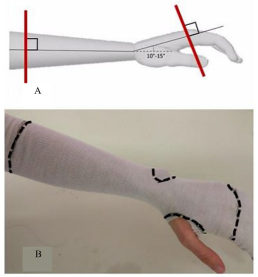 Neutral “thumb-up” position with the wrist in slight extension (10–15°) (A). The base of the thumb, the head of the metacarpals and the ulnar styloid positions are then marked by the operator (B).