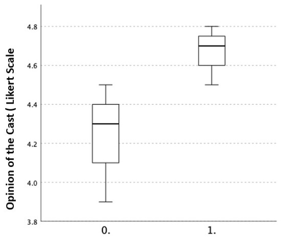 All answers to the evaluation questionnaire ranged in the positive scores, both in children as well as in parents, and the median scores were generally overlapping. No statistically significant differences were observed. Mean scores for each item at each evaluation are reported in Table 3. Interestingly, parents reported a higher overall opinion of the cast, although not statistically significant (Figure 6).
