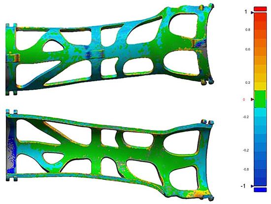 No permanent deformations were measured after 3D scanning of the used orthosis. The averaged measured error between the original cast 3D file and the acquisition of the used 3D printed cast, over the 10 examined cases, was 1 mm with a maximum error of 2 mm, considering the absolute minimum and maximum values (deviation values are shown in Table 4). This confirmed that all casts remained intact. An example of the comparison between the used and original orthosis 3D file is reported in Figure 7.