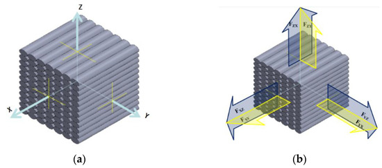 Load direction was determined to explore the anisotropy of printed composites. Figure 2a shows that the three directions of X, Y, and Z are orthogonal. The X, Y, and Z directions are the outer points perpendicular to the centre of the cross-section of the printed layer, the profile center of the printed layer, and the center of the plane section of the print layer, respectively. Fxy and Fxz are the X-direction line loads, which extend in Y direction and Z direction, respectively, as shown in Figure 2b. Fyx and Fyz represent the line loads in the Y direction extending in the X direction and Z direction, respectively. Fzx and Fzy denote the Z-direction line loads extending in the X direction and Y direction, respectively.