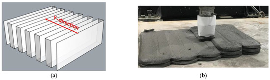 The mix proportion of printable mortar referred to in Table 3 was used for the mechanical performance test. The structure was extruded and deposited by 3DCP equipment according to the designative printing path, as shown in Figure 3. Additionally, the printing direction of each layer was Y. The height, width of printing nozzle, and nozzle moving velocity were 38 mm, 14 mm, and 12 cm/s, respectively. To improve printing efficiency and structure quality, a large-sized printing nozzle was used for the structure fabrication. Moreover, it enabled a more stable deposition of the printing filaments compared to the circular nozzle, preventing collapse. Each layer was manufactured with 12 round-trip continuous paths and the number of vertical deposition layers was 20. The printing path interval was 40 mm and the height of each layer was set to 13 mm. The structure used a bucket (0.05 m3) of printing material and its printing time was 15 min. The open time of the mortar was 40 min. The printing and equipment parameters were based on previous experimental results of buildability and extrudability [60]. The round-trip continuous paths ensured that the mutual extrusion of printing filament was not improved.