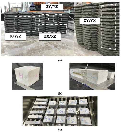 By adopting the Chinese national standard GB/T 50081-2002 [63,64], compressive, flexural, and tensile tests were employed to evaluate the mechanical performance influenced by various steam curing conditions. The cube samples (100 mm × 100 mm × 100 mm) and prismatic specimens (50 mm × 50 mm × 200 mm), used in different direction tests, were obtained by structural cutting after 8 h of natural maintenance, as shown in Figure 4a,b. A printed structure was cut into three cube compression test samples; and three cube specimens were used in the X, Y, and Z directions splitting tension test, as shown in Figure 4a. The splitting tension test specimens in the X direction were loaded in an XY or XZ direction, specimens in the Y directions were loaded in an YX or YZ direction, and specimens in the Z directions were loaded in an ZX or ZY direction. Six prismatic flexure tests specimens loaded in various directions (XY, XZ, YX, YZ, ZX, and ZY) were acquired from the printed structure. To ensure the accuracy of the mechanical properties experiment, the cube or prismatic specimens, which were employed in the same direction test, were cut from the same position in the printed structures and had the same interlayer number. After an 8-h cut time, the test samples were placed into a zky-400b steam box to cure one circle, as shown in Figure 4c.The steam curing conditions of the printed samples refer to the orthogonal experimental design (Table 4). Subsequently, the test samples were cured for 28 days in natural conditions. The experiments of 28-day compressive, flexural, and tensile performance utilized 9 group samples with various steam curing conditions and 2 control groups cured in natural conditions. Subsequently, uniaxial compressive strength in the X, Y, and Z directions was determined by compression tests in which each group contained three cube specimens, as shown in Figure 5a.Each group of flexural and splitting tensile capacity tests contained six prismatic specimens to be under the line flexural and tensile load of XY, XZ, YX, YZ, ZX, and ZY directions, as shown in Figure 5b,c. Moreover, the average and coefficient of variation of mechanical performance were obtained by measuring three group samples at each curing condition from Table 4.