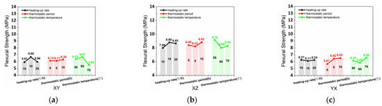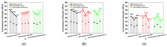 The optimal curing conditions were 15 °C/h (heating-up rate), 10 h (thermostatic period), and 60 °C (thermostatic temperature) for FSxy, as presented in Figure 8a. Figure 8b demonstrates the optimal steam curing conditions (15 °C/h heating-up rate, 10 h thermostatic period, and 50 °C thermostatic temperature) for FSxz. Figure 8c shows that the optimal curing conditions of heating-up rate, thermostatic period, and thermostatic temperature for FSyx were 10 °C/h, 10 h, and 70 °C, respectively. Figure 8d exhibits that 20 °C/h heating-up rate, 8h thermostatic period, 50 °C thermostatic temperature were the optimal curing conditions for FSyz. Dor FSyx, 20 °C/h, 8 h, and 60 °C were the optimal heating-up rate, thermostatic period, and thermostatic temperature of curing condition, as shown in Figure 8e. Figure 8f demonstrates that the optimal curing conditions were 10 °C/h (heating-up rate), 8 h (thermostatic period), and 70 °C (thermostatic temperature) for FSzy.