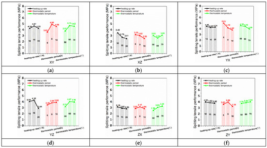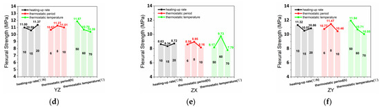 The average values of TSxy, TSxz, TSyx, TSyz, TSzx, and TSzy are obtained by the results and calculations of the orthogonal test, as shown in Figure 7. The relation between TSxy and the three curing conditions (thermostatic period, thermostatic temperature, heating-up rate) was a parabolic correlation as presented in Figure 7a. Meanwhile, the optimal curing conditions were 15 °C/h (heating-up rate), 8 h (thermostatic period), and 60 °C (thermostatic temperature) for TSxy. Figure 7b demonstrates that TSxz had a negative correlation, negative correlation, and parabolic correlation with heating-up rate, thermostatic period, and thermostatic temperature, respectively. A heating-up rate of 10 °C/h, 6h thermostatic period, and 70 °C thermostatic temperature were the optimal curing conditions for TSxz. Figure 7c shows that the optimal curing conditions of heating-up rate, thermostatic period, and thermostatic temperature for TSyx were 10 °C/h, 6 h, 50 °C, respectively. Parabolic correlation, negative correlation, and negative correlation, respectively, are the relation between TSyx and the three curing conditions (heating-up rate, thermostatic period, and thermostatic temperature). Figure 7d shows that TSyz had a negative correlation with heating-up rate, negative correlation with thermostatic period, and parabolic correlation with thermostatic temperature. A 15 °C/h heating-up rate, 10h thermostatic period, and 60 °C thermostatic temperature were the optimal curing conditions for TSyz. A negative correlation, parabolic correlation, and positive correlation were the relation of TSyx with the heating-up rate, thermostatic period, and thermostatic temperature, respectively, as shown in Figure 7e. For TSyx 10 °C/h, 8 h, and 70 °C were the optimal heating-up rate, thermostatic period, and thermostatic temperature for curing conditions. Figure 7f demonstrates that heating-up rate, thermostatic period, and thermostatic temperature had a negative correlation, parabolic correlation, and positive correlation, respectively, with TSzy. Furthermore, the optimal curing conditions were 10 °C/h (heating-up rate), 8 h (thermostatic period), and 70 °C (thermostatic temperature) for TSzy.