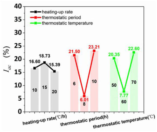 Figure 9. Iac affected by various heating-up rates, thermostatic periods, and thermostatic temperatures.