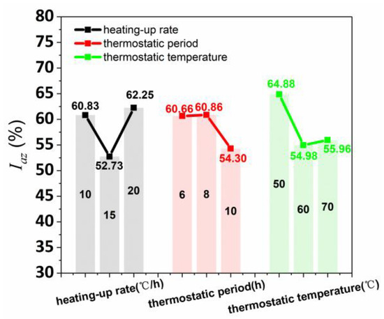 Figure 11. Iaz affected by various heating-up rates, thermostatic periods, and thermostatic temperatures.