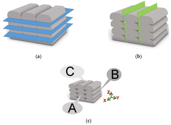 Figure 13. The horizontal interlayer diagrammatic sketch between printing layers (a), the vertical interlayer diagrammatic sketch between printing filaments (b), and the diagrammatic sketch of printed cube sample faces (c).