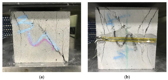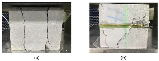 The printable filament height and weight were 38mm and 13mm, respectively. The layer height of printable mortar was lower than the nozzle height of the printer due to the additional pressure of the upper printed layer. Figure 13a,b exhibit the diagrammatic sketches of horizontal interlayer and vertical interlayer, respectively, for the printed materials using the 3DCP method. Figure 13c and Figure 14 show that the main crack angle generated on the C plane was oblique 45°, which was different from cast (20°–30°) when the X-direction compression was loaded on the samples. Additionally, some vertical cracks were generated on the C plane because the weak interlayer influenced the slenderness ratio and shear span ratio of the printed material to result in shearing failure.