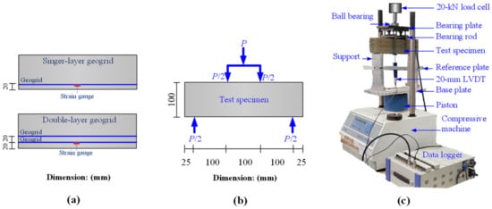 - The characteristics of the flexural stress–deflection curves were affected by the uniaxial geogrid strengths and the number of reinforcement layers, which could be classified into main three categories, including (i) deflection-softening behavior with a smaller peak strength than residual strength, (ii) deflection-hardening behavior with a smaller peak strength than residual strength, and (iii) deflection-hardening behavior with a peak strength equal to residual strength.