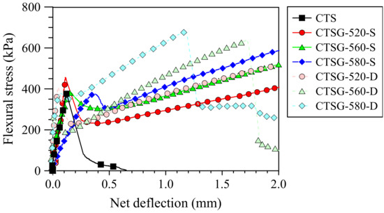 3.1. Characteristics of Flexural Stress—Deflection Curves