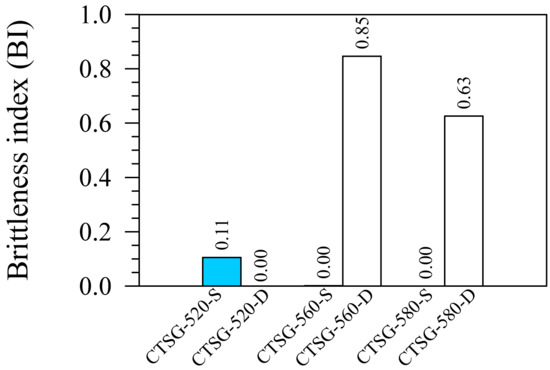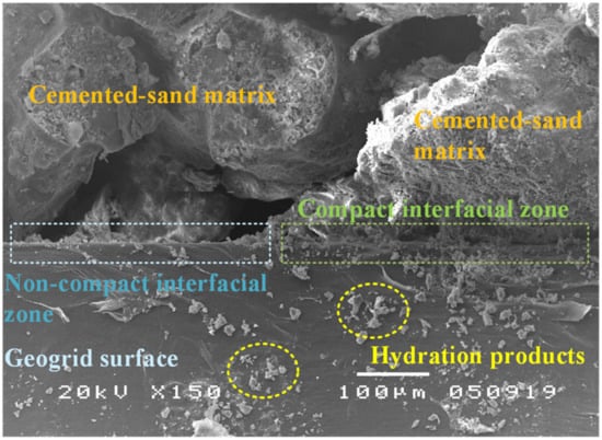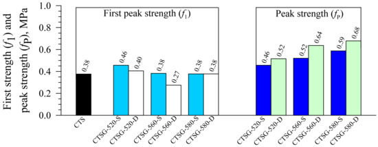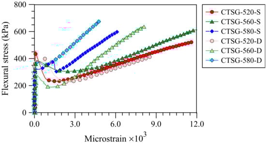 - After the first cracks occur, the geogrids start to reinforce the CTSG samples. The high-strength geogrid provided a smaller strain level than the low-strength geogrid. Double reinforcement exhibited a smaller strain value than single reinforcement.