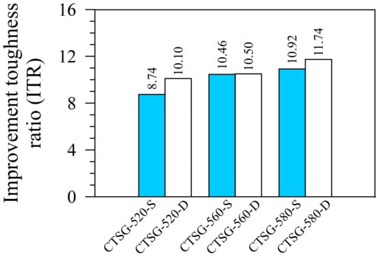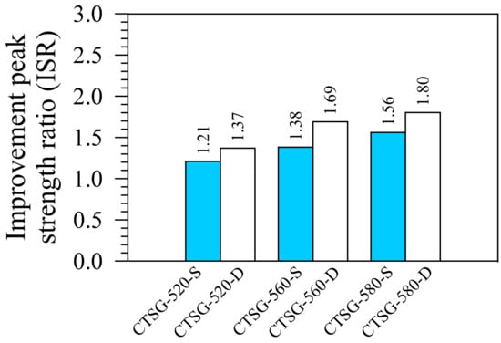 - The geogrid reinforcement had no impact on the first peak strengths. The peak strengths of the CTSG specimens increased with increasing geogrid strengths and the number of reinforcement layers. The geogrid reinforcement can improve the peak strength of CTS by up to 1.8 times. The geogrid reinforcement improved the toughness rather than peak strength because the improvement toughness ratio is greater than the improvement strength ratio.