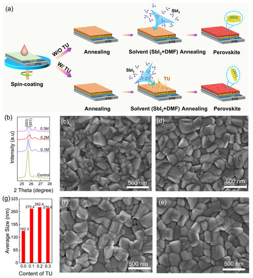Figure 1a illustrates the preparation processes of the Sb-based perovskite thin film. For the W/O TU case, the films were first annealed at 70 °C for 10 min, ensuring the organic solvents could be removed completely, and then annealed in SbI3 vapour at 250 °C for 15 min. Finally, the perovskite film was obtained. The high SbI3 vapour pressure was considerable at 250 °C and effectively prevented the Cs3Sb2I9−xClx film from losing SbI3 [22,23]. For the W/TU case, TU decomposed during the SbI3 vapour annealing process. Figure S1a illustrates the XRD patterns of Cs3Sb2I9−xClx films containing various amounts of TU additives. The diffraction peaks at 8.7°, 17.2°, 21.0°, 25.7°, 25.9°, 29.9°, 42.7°, and 42.9° were ascribed to the (001), (002), (102), (003), (201), (022), (204), and (220) planes of the 2D Cs3Sb2I9−xClx crystal phase, respectively [24]. Figure 1b shows an enlarged view of the (003) and (201) peaks in Figure S1a. In Figure 1b and Figure S1a, the relative intensities of (001), (002), and (003) peaks decrease with increasing amounts of TU. According to previous reports, the orientation of the (001), (002), and (003) planes parallel to the substrate leads to carrier transport anisotropy, which strongly limits the devices performance [10]. In addition, it can be observed in Figure 1b that the intensity of the (201) diffraction peak increases with an increasing amount of TU. The calculated data of the XRD parameters are shown in Table S1. The FWHM of the (201) plane for control, 0.1 M, 0.2 M, and 0.3 M TU additive Cs3Sb2I9−xClx films was 1.516, 0.464, 0.436, and 0.454, respectively. The crystallite size of the Cs3Sb2I9−xClx films was calculated by the Scherrer equation [25], the corresponding crystallite size for control, 0.1 M, 0.2 M, and 0.3 M TU was 5.621, 18.393, 19.356, and 18.795, respectively. The dislocation density of the (201) peak for control, 0.1 M, 0.2 M, and 0.3 M TU additive Cs3Sb2I9−xClx films was 31.88, 2.96, 2.61, and 2.85, respectively. The lattice constants for control, 0.1 M, 0.2 M, and 0.3 M are also listed in Table S1. It was found that the 0.2 M TU additive enhanced the crystallinity of the Cs3Sb2I9−xClx films. To further understand the influence of TU on the crystal orientation of the Cs3Sb2I9−xClx, we calculated the peak intensity ratio (201)/(003) for the Cs3Sb2I9−xClx films, and the results are shown in Figure S1b and Table S2. For the control sample, the peak intensity ratio of the (201)/(003) diffraction peaks is 0, since the (201) peak is barely detectable. The peak intensity ratios of the (201)/(003) diffraction peaks are 0.34, 2.01, and 1.25 for the 0.1 M, 0.2 M, and 0.3 M TU additives, respectively. The maximum value of (201)/(003) for the 0.2 M TU additive Cs3Sb2ClxI9−x films exhibits the preferred (201) growth orientation of the Cs3Sb2I9−xClx crystals (Figure S1b). Figure 1c–f shows the scanning electron microscopy (SEM) images of the control, 0.1 M, 0.2 M, and 0.3 M TU additive Cs3Sb2I9−xClx films. The film without TU (Figure 1c) shows a rough and irregular morphology with small grain sizes. In contrast, films with the TU additive (Figure 1d–f) exhibit a smooth and compact film with a large grain. In particular, the 0.2 M TU additive film demonstrates the largest grain sizes and high compactness. According to Lewis acid–base adduction matching rules, sulphur is a kind of soft base that can form a stable coordination with Sb3+, further modulating perovskite nucleation and crystallization [26,27]. However, further increasing the addition of TU to 0.3 M results in cavities on the surface of the perovskite, which could be due to the gas generated from TU thermal decomposition (CH4N2S = H2S + CH2N) [19]. Meanwhile, the statistical distribution of grain sizes in the Cs3Sb2I9−xClx films with the addition of different amounts of TU obtained from top-view SEM images using nano measurer software is shown in Figure 1g. Apparently, the average grain size of perovskite increases significantly after the addition of TU. It is worth noting that the 0.2 M TU additive Cs3Sb2ClxI9−x films show a maximum average grain size of 282.4 nm, which is much larger than that of the control film of 162.3 nm (Figure 1g). The increase in the grain sizes and reduction in the boundary areas could reduce charge carrier trapping [28]. In Figure S2a,b, the film roughness of the control and 0.2 M TU additive Cs3Sb2I9−xClx films were 72.6 nm and 21.9 nm, respectively, indicating that the 0.2 M TU additive Cs3Sb2I9−xClx films have small surface roughness. Figure S2c,d show the Kelvin probe force microscope (KPFM) of the control and the 0.2 M TU additive Cs3Sb2I9−xClx films, respectively. The 0.2 M TU additive Cs3Sb2I9−xClx films surface exhibited a higher electronic chemical potential than that of the control film, resulting from a low surface trap density and high carrier concentration [29,30]. Additionally, to further explore the dispersion of elements in the perovskite film, energy-dispersive spectroscopy (EDS) mapping was carried out to characterize the 0.2 M TU additive Cs3Sb2I9−xClx films (Figure S3). As shown in Figure S3, the films demonstrate a uniform distribution of the Cs, Sb, I, and Cl elements. Meanwhile, no S was found in the film.