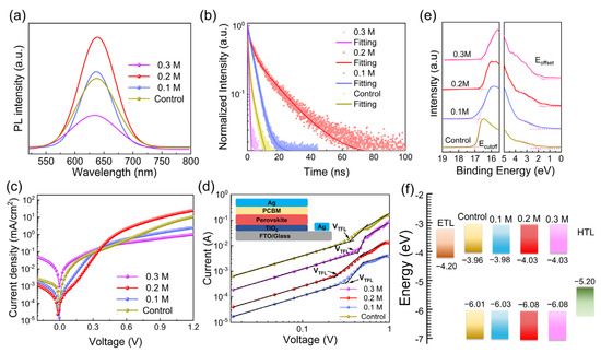 Moreover, to evaluate the charge transfer properties of the devices, the electron state density (Ntrap) was calculated. We also measured J–V curves of devices in the dark (Figure 4c). The 0.2 M TU additive Cs3Sb2I9−xClx films had a much lower leakage current than the other devices, which might be associated with the increase of grain size and reduction of defects in the film [37]. Space for charge limited current (SCLC) also was used to estimate defect properties of the devices and the results are shown in Figure 4c and Table S4. The trap state densities were calculated on the basis of the formula: [38] Nt = 2ε0εVTFL/qL2 (q is the elemental charge, ε0 is the vacuum permittivity, ε is the relative dielectric constant and L is the thickness of the Cs3Sb2I9−xClx film). For the 0.2 M TU additive Cs3Sb2I9−xClx films, the lower trap-filled limit voltage (VTFL) was 0.23 V for electron-only, which indicated the trap density had an impressive reduction. Ultraviolet photoelectron spectroscopy (UPS) results in Figure 4e show that the control, 0.1 M TU, 0.2 M TU, and 0.3 M TU additive Cs3Sb2I9−xClx films have valence band maxima at −6.01 eV, −6.03 eV, −6.08 and −6.08 eV, respectively. Figure 4f shows a schematic energy level diagram of the materials used in the device. Figure S9 shows the band energy diagrams for the control, 0.1 M, 0.2 M and 0.3M TU additive Cs3Sb2I9−xClx PSCs. The energy-level alignment of the conduction band minimum between Cs3Sb2I9−xClx and TiO2 was improved through the addition of TU into Cs3Sb2I9−xClx film. The VB/CB edge of the absorber shifted downwards upon the addition of TU. These downshifts in VB/CB benefited the electric charge transport and improved the PCE [39].