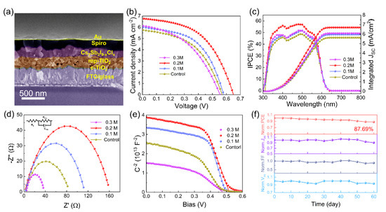 where C is the capacitance, V is the applied voltage, Vbi is the built–in potential, A is the device area, ε is the relative permittivity, ε0 is the vacuum permittivity, and NA is the carrier concentration. As shown in Figure 5e, the Vbi of 0.2 M TU additive Cs3Sb2I9−xClx PSCs was 0.65 V, which was higher than that of the control, 0.1 M TU additive, and 0.3 M TU additive devices 0.49 V, 0.46 V, and 0.45 V, respectively. The increasing Vbi benefitted the separation of the photogenerated carriers, which suppressed the electron-hole recombination and the [42]. The long-term stability of the 0.2 M TU additive Cs3Sb2I9−xClx solar cells in N2 environment conditions was observed (Figure 5f). The PCE of the optimal device retained approximately 87.69% of the initial value after 60 days.