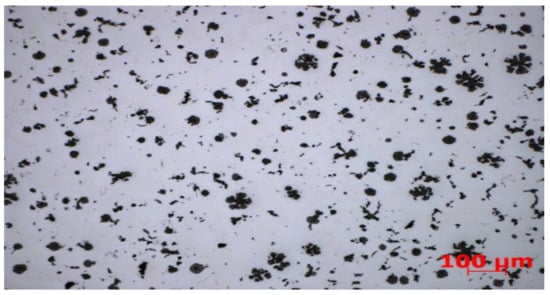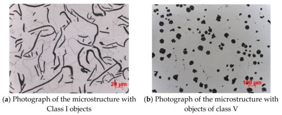 The collected data in the form of photos of the castings microstructure were tested for suitability. The images related to the data were divided according to the lower and higher value of the limit of elasticity. The subset containing the images with the lower limit of elasticity consisted of 68 instances, while the subset containing the images with the higher value of the limit of elasticity consisted of 47 instances. All images in this dataset were 1388 × 1040 in size. There were 115 instances in total in this collection. In another comparison, the data were divided according to the lower and higher value of tensile strength. The subset containing the images with the lower tensile strength consisted of 65 instances, while the image subset with the higher tensile strength consisted of 158 instances, hence 42 in total. There were 223 images in the examined set. This time, however, 138 instances are 1388 × 1040, while the remaining 85 instances are 2080 × 1540. All photos were taken with the LOM technique. Additionally, all photos are in RGB format, so they have three channels. After converting to grayscale, you can hardly see the difference. The vast majority of them have a hundredfold or five hundredfold approximation, while there are also photos with a twelve-and-a-half or fifty-fold approximation (although these are isolated cases). A close-up of a photo can be read from its file name, although photos with the same approximation may still differ slightly in their scale. Figure 1 shows an example of a microstructure. In the lower right corner of each shot there is a scale marked in red which shows the actual distance of the specified portion from the photo. Black structures on a gray background are a constant theme in these photos; these are the components of the structure of iron-carbon alloys, which we divide into six main categories based on their shape. These classes are shown in Figure 2. This split data will be used as input (i.e., the number of structures for each category) for traditional categorization models in research. This means that, like specialists in this field, we will try to predict the mechanical properties of castings based on the number of different forms in microstructures. Comparing the expertise with the knowledge extracted by the classifiers will be straightforward, making the models highly interpretable. Finally, you will be able to compare these results with those of the neural network.