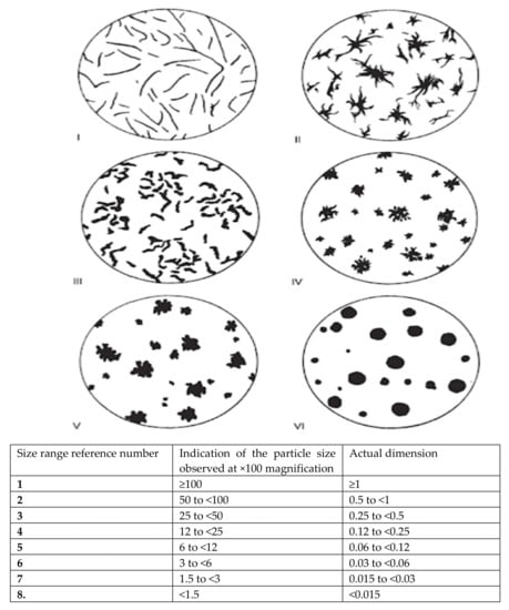Reference images for the main graphite forms in cast iron. Source: [12]. Dimensions of graphite particle forms I to VI.