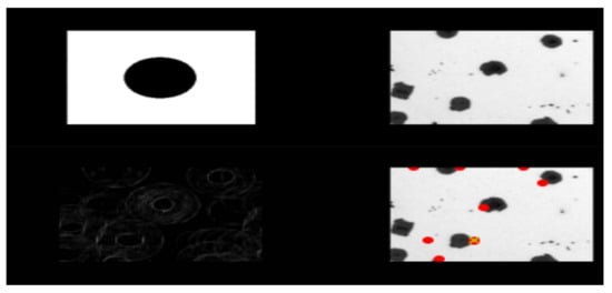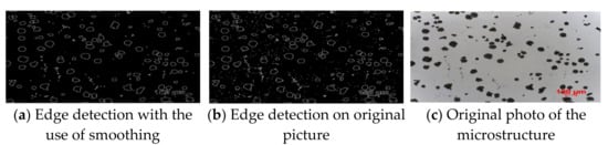 This research was divided into two major stages. The first was to identify single structures present in the images of microstructures. This involved delineating the contours of these objects, then cutting them out and creating a database from them, which required “manual” assignment of images to seven classes. Then, using this dataset, it would be possible to train a neural network that recognizes these shapes. Experiments began to test Hu moments and Haralick’s textures to classify entire microstructure images and find out which shapes are the most numerous. The next step was to test the generalized Hough transform. Following these tests, research into more sophisticated methods that could be applied more automatically began. The second stage consisted in assessing the quality of castings with the use of techniques developed in the first stage, using classic classifiers, but also using neural networks. First, Hu moments were used to extract features from the images that could be used to classify. The Haralick textures were tested analogously. These features were given as input to the classical classifiers. Then, comprehensive studies were carried out, which used the number of structures of specific classes found in the photos of microstructures, as well as classic classifiers. All obtained results were compared taking into account many aspects such as interpretability of results, ease of implementation, simplicity of algorithms, and learning time. In order to have an overview of the whole situation, the most effective neural network architectures used for the classification of images were also tested, and they were compared on a multi-plane basis with other results. Hu moments and Haralick textures were tested as a first approach, although they were also used to evaluate the quality of castings. The initial struggle showed that finding single structures of a given class with this method is possible, although not for all shapes. An example of a mistake is shown in Figure 4. GHT is believed to have advantages such as: