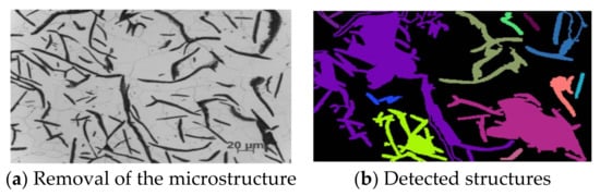 The shapes that were treated as one object are marked with the same color. Structures in the image marked with the same color (and therefore considered as a single object) are cut out and placed against a white background. They will be used to train categorization models in subsequent phases. On the other hand, as you can see in the image above, the downside to this technique is that the structures are sometimes linked together and then treated as a single entity by the algorithm. This is most common with Grades I and II, which are stretched out in photos and are often in contact with each other. Attempts have been made to avoid this with algorithms such as erosion and thresholding, but these approaches have not achieved the desired results. In another example, the elements have been cut out separately. Only the combined shapes were cut out as one whole. Unfortunately, there is no universal solution for this; once a problem is solved, a new one appears, for instance less visible structures not being cut out, or the detection of faded structures that should be omitted. Objects cut in this way are introduced to the input of the neural network, which will be trained to categorize these structures. We have seven different classes in our collection. Six of them are the shapes highlighted in the standard [14], while the author added a seventh grade to distinguish these structures from objects that were poorly cut or containing the scale that can be found in all microstructure photos. All cut elements were stored locally and arbitrarily assigned to classes when the dataset was created. At this stage of the research, we already have personally prepared data on individual structures. Again, experiments could be commenced with the simplest methods such as Hu moments, Zernike moments, and Haralick textures, along with classical classifiers, although this approach has already been tested in [15] and it has been shown that in the case of such sets of algorithms and available data, the results are comparable to those we obtain when using classic classifiers with input in the form of pixels. Therefore, here we will go straight to the more advanced methods. For this purpose, it was decided to use neural networks. In particular, transfer learning was applied using the VGG19 network. The implementation of this architecture was obtained from the Keras library. During the training, this network was excluded from training. In addition, its tip was not included, but several additional layers were added, which allowed us to train the network for our data. The Adam optimizer was used, the batch size was 1, while the number of epochs was 100. Such a network on average achieves an efficiency of about 82% for test data (in the case of training data, the accuracy ranges from 86% to 95% efficiency, depending on the configuration), the value of the metric F1 is 0.79, and logistic loss is 0.66. These are better results than in the previously quoted work [15] due to the fact that we are working on corrected data, which was described in detail in the quoted work. After conversion to the relative error, we get errors of 10%, 52%, 26%, 50%, 49%, and 1% for classes I to VI, respectively (no class “0” in the test data due to their low frequency). However, errors are mainly due to the similarity of these forms within “adjacent” classes such as classes V and VI (in the figure these are classes 4 and 5), where almost half of the shapes in class V are classified as class VI. The similarity of classes is more evident in the case of real data, as most of these shapes contain features of many classes (they are difficult to attribute to one specific feature). The discrepancy in prediction accuracy between classes is most likely related to an imbalance in the amount of data available for each class. On the other hand, the results appear to be much better when using training data for evaluation. After calculating the relative errors, we achieve the following results: 36% (class “0”), 0.4%, 20%, 7%, 19%, 38%, and 3%. We can observe that the training data have far fewer relative errors, indicating that the results can still be improved. Data balancing may be a good direction, because, as you can see, the best results are obtained for classes whose number of instances was the largest in the set (except for class V, although examples of this class are confusingly similar to examples from class VI). Thus, a strategy was adopted to extend the data from these classes, which at the same time have the lowest effectiveness and the fewest examples. Hence, the following classes will be extended: “0”, II, IV, and V. The reflection method will be used, which does not change the size of the image. The horizontal reflection method will also be used this time. In addition, several other approaches were tested, such as superimposing noise on extended examples of data, as well as removing gray from the images. The manipulation of the data did not positively influence the classification result architecture, for which the best results were achieved. Given the imbalance of the classes and the fact that these data were prepared by hand by the author of this work (who is not a metallurgical specialist), in order to improve the results of this classification it is likely that an expert should prepare it in the field. In further research, the architecture will be used together with the data for which the highest results were obtained, i.e., the VGG19 neural network with the originally prepared images of the structures. In testing, there are sample photos that represent the whole process well; with these, it looks like operations are performed for each input photo and then classified by the architecture presented in this chapter. Therefore, errors may occur, such as failure to detect a given structure or misclassification of the structure. The network classifying shapes together with the whole sequence of recognizing individual structures bring