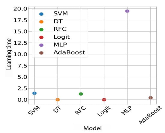 This is the highest accuracy that has been achieved for this type of data. The table below shows the results that were achieved with this model for the different input types. There was a significant drop in effectiveness; a possible explanation is that the model is overfitting with the training data. As you know, reinforcement-based models tend to do so, all the more so as the advanced data contains 40% of all available data. As can be seen, for unbalanced data, support vector machine, random forest, and AdaBoost machine models perform well, which is the expected result as these are very popular algorithms, generally considered robust. In contrast, for balanced data, undoubtedly the best model is the multilayer perceptron, which achieved the best values for all metrics. In addition to this extensive comparison of models based on performance metrics, graphs were also prepared showing the average training times and the times of returning the results for individual models. As we can see, it takes by far the longest to train a multilayer perceptron model, which is understandable because it is actually a neural network with many neurons per layer and hundreds of iterations. Then, we have models of the support vector machine and the random forest. SVM is based on the kernel function, and big data can run slowly. On the other hand, the random forest consists of hundreds of individual models (so-called weak classifiers); in this case they are the so-called decision stumps, i.e., decision trees with a depth equal to one. Training the RFC model is more than 400 times longer than a single decision tree, which would be consistent with the fact that the tests used a random forest model with 473 trees. Next, we have the AdaBoost model. This model also consists of many weak classifiers, and they are also decision stumps. Since there are 50 of them, its learning time is correspondingly longer. The other two models, i.e., the decision tree and logistic regression, have by far the shortest learning times (close to zero) (Figure 10).