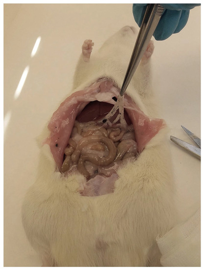 The peritoneal cavity provides a wide surface for drug absorption, which allows for quick transport into the blood flow. Nonetheless, there is a risk of puncturing the small intestine or producing adhesions or severe infections. None of these occurred in our case, and all animals showed a normal response to administration through the intraperitoneal route.