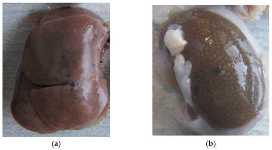 The largest aggregates were seen in the proximity of the injection site—in the connective tissue of the abdominal skin, muscles, and peritoneum. Numerous smaller spherical aggregates (around 2 mm diameter) were lodged in the mesentery (Figure 1).