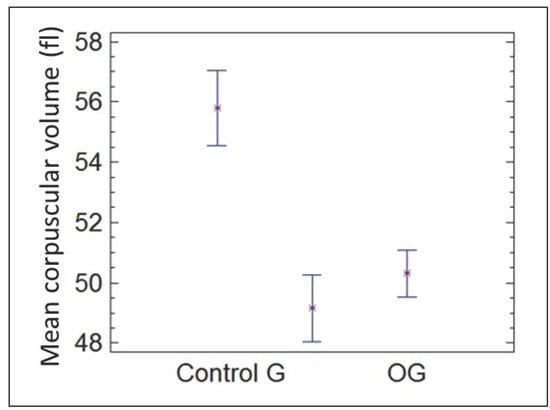 Figure 3 shows the mean corpuscular volume after 30 days for the groups control, G, and GO. After 30 days, the decrease in red blood cell corpuscular volume remained significant in both groups G and GO.