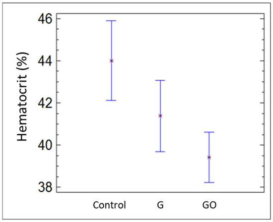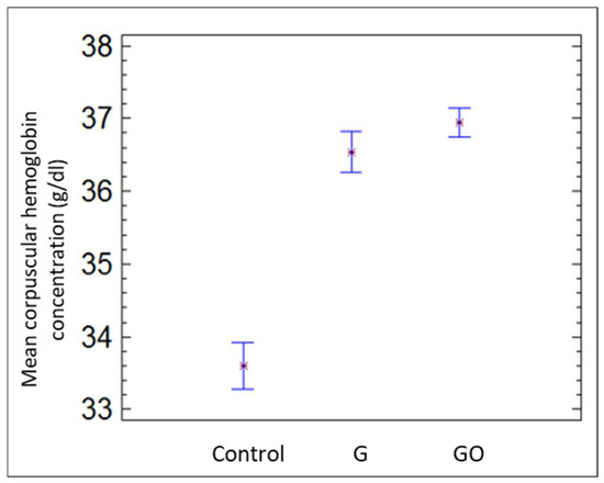 Figure 4 contains the mean corpuscular hemoglobin concentration for the groups control, G, and GO after 30 days. Mean corpuscular hemoglobin concentration increased significantly in the G and GO groups compared with the control group. Nonetheless, hematocrit decreased in both groups, as shown in Figure 5.