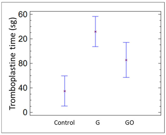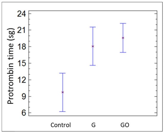 The platelet count was similar in the three groups. Nevertheless, the prothrombin and thromboplastin times were significantly longer in the G and GO groups than in the control group (p = 0.037), as shown in Figure 6 and Figure 7, respectively.