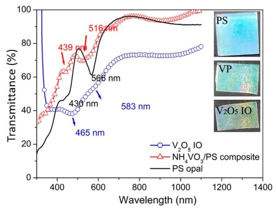 UV-vis NIR transmittance spectra of PS opal, NH4VO3/PS opal composite, and V2O5 IO monolayer films are shown in Figure 2. Similar to the observation of SEM, all samples showed large-area highly ordered array structures, noticeable from the reflection peaks. Reflection maxima appeared in the 430–470 nm range for the PS opal, NH4VO3/PS opal composite, and V2O5 IO monolayer films, rendering a blue color. The other reflection maxima for the PS opal and NH4VO3/PS opal composite occurred in the 510–560 nm range, corresponding to green color, while the next reflection maximum for the V2O5 IO monolayer film showed a slight red shift to 583 nm, which was within the light orange region (580–650 nm). Apart from it, the reflection showed a slight blue shift from PS opal to VP opal composite and then a red shift from VP opal composite to VIO monolayer films, which indicated that the opal structure period of the films increased and decreased, respectively. Such results agreed with the SEM observation (Figure 1), in which the opal structure periods were 443 nm for the PS opal, 451 nm for the VP opal composite, and 428 nm for V2O5 IO. The composite color from these two reflection regions was blue-green, which matched well with the optical photos (Figure 2, inset), demonstrating their structural blue-green color. After calcination, V2O5 IO showed blue-green-golden color, which indicated a combination of structural color and the original V2O5 orange-yellow color.