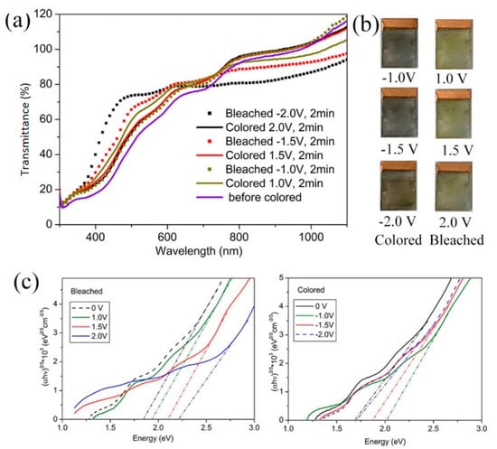 As for the bleached states, which is an oxidation process, the bandgap in the visible region increased as the bleaching voltage was applied: considering that the film at 0 V could be non-stoichiometric V2O5, as the bleaching voltage increased, the stoichiometry was improved. This change increased the Eg and thus increased the transmittance in the visible region. However, the transmittance in the NIR region showed the opposite behavior.