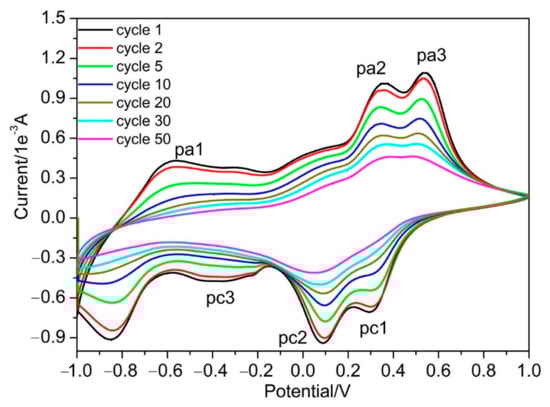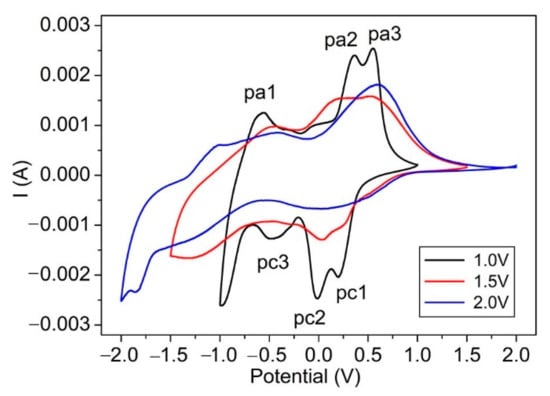 The CV of V2O5 IO film showed three cathodic reduction peaks (pc1, pc2, pc3) attributed to lithium intercalation and three anodic peaks (pa1, pa2, pa3), which corresponded to lithium extraction. Different peaks are ascribed to the formation of different crystalline phases of LixV2O5 or successive redox/oxidic reactions [3,41]. The film under a potential window of ±1.0 V showed better-defined peaks, and there was no significant difference in the intercalation and deintercalation capacities or cathodic and corresponding anodic current, indicating its good reversibility. The overall shape of the CVs for the film at a potential window of ±1.5 V had some distortion in contrast to that under a potential window of ±1.0 V, and the three cathodic and anodic peaks broadened and merged together to form two peaks. This change became more obvious for the film at a potential window of ±2.0 V, where a vast asymmetry was observed, indicating its irreversibility as well as a deterioration of the film. Such irreversibility could be attributed to the formation of an irreversible rock-salt phase of -Li3V2O5 when cycled around 1.9 V [22] or a partial dissolution and/or a film delamination [3]. Due to the structure change and deterioration of the film—which increased with the bleaching voltage—the NIR absorption increased accordingly, which was consistent with the observation in Figure 4.