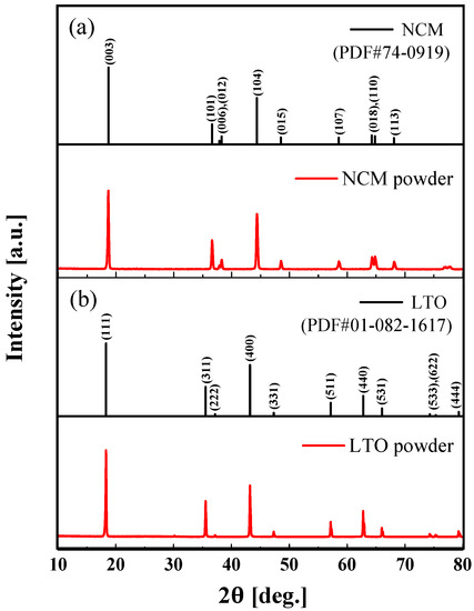Figure 2a,b, respectively, depict the XRD patterns of the NCM and LTO powders. As shown in Figure 2, the XRD patterns of NCM and LTO powder were identified and indexed with the powder diffraction database (PDF). The XRD peaks of NCM powders around 18.7°, 36.6°, 37.9°, 38.7°, 44.4°, 48.5°, 58.5°, 64.3°, 64.8°, and 68.1° are assigned to the (0 0 3), (1 0 1), (0 0 6), (0 1 2), (1 0 4), (0 1 5), (1 0 7), (0 1 8), (1 1 0), and (1 1 3) planes, respectively. The diffraction peaks of LTO powders around 18.3°, 35.5°, 37.1°, 43.2°, 47.3°, 57.1°, 62.7°, 66.0°, 74.2°, 75.2°, and 79.2° are assigned to the (1 1 1), (3 3 1), (2 2 2), (4 0 0), (3 3 1), (3 3 3), (4 4 0), (5 3 1), (5 3 3), (6 2 2), and (4 4 4) planes, respectively. The XRD measurement results showed that the NCM and LTO powders were successfully synthesized.