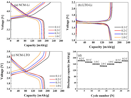 Electrochemical properties of (a) NCM-Li, (b) LTO-Li, and (c) NCM-LTO full-cells, and (d) rate capability of the NCM-LTO full-cell at various C-rates.