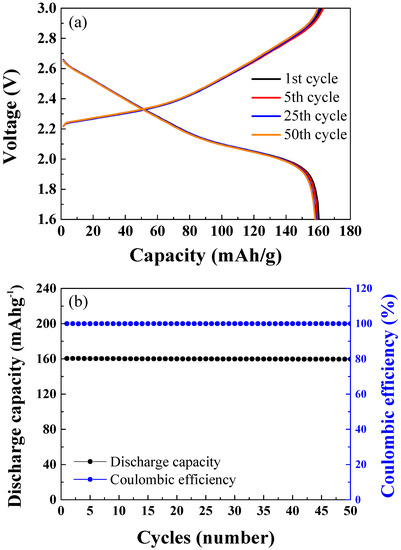 Figure 4a,b show the results of cycle tests for 50 cycles of the NCM-LTO full-cell at 1 C-rate. The charge–discharge was carried out in the 1.6–3.0 V range. The discharge capacities were 160.48 mAhg−1 at the 1st cycle, 160.32 mAhg−1 at the 5th cycle, 159.97 mAhg−1 at the 25th cycle, and 159.89 mAhg−1 at the 50th cycle. The NCM-LTO full-cell exhibited excellent cycle retention of 99.63% even after 50 cycles. Figure 4b shows the discharge capacities and coulombic efficiency with respect to the cycle number for 50 cycles. In cycles 1, 5, 25, and 50, the coulombic efficiencies were 99.99%, 99.98%, 99.97%, and 99.95%, respectively. This shows the exceptional stability of the electrode materials.