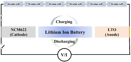 Environmental problems caused by fossil fuels, such as greenhouse gas (GHG) emissions, drought, and rising sea levels, have recently become major global issues [1,2]. Therefore, many studies have investigated eco-friendly renewable energy sources (solar, wind, geothermal, etc.) that generate electricity with a minimal carbon footprint [3]. Solar energy systems have attracted the most attention among these renewable energy sources as the sun is a popular infinite free energy source. Therefore, photovoltaics (PV) have the potential to meet the global energy demand [4]. However, the intermittent availability of sunlight is a significant drawback that hinders its various applications. In the present study, the idea is to connect the solar cell to LIB directly without any converter. The integration of energy generation and energy storage systems has been presented as one of the better solutions to address the intermittent nature of sunlight [5]. Liao et al. reported the need for a bidirectional DC/DC converter to control a solar power system [6]. The bidirectional DC/DC converter system was more complex and expensive than the direct connection of the solar cell and the energy storage device. Therefore, a direct DC storage system is currently in the spotlight by using the integrated device as a promising technology. Many studies have used capacitors and lithium-ion batteries (LIBs) as storage for charging by PVs [7,8,9,10,11].