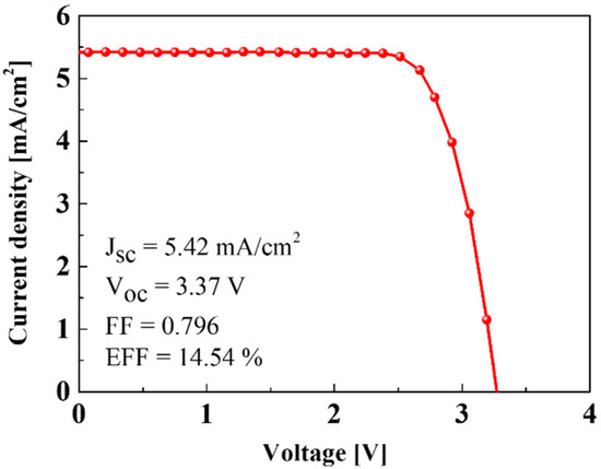 Figure 6 depicts the current density-voltage (J-V) characteristics of the interconnected Si solar cells. The short-circuit photocurrent density (JSC) and open-circuit voltage (VOC) of a Si solar cell were 5.42 mA/cm2 and 3.37 V. The interconnected Si solar cells can provide the required voltage to charge the NCM-LTO full-cell. The fill factor (FF) and efficiency of the Si solar cells were calculated to be 0.796 and 14.54%, respectively. The Si solar cells used in this study have displayed a slightly higher efficiency of 14.54%, compared to commercially available Si solar cells, which are typically about 12–15% [20].