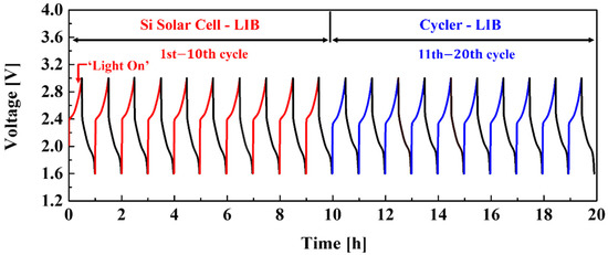 Figure 7 shows the electrochemical results of the integrated device. The charge–discharge tests were carried out for 20 cycles in the 1.6–3.0 V range. The integrated device was charged by the Si solar cells using a solar simulator and discharged by a battery cycler to the 10th cycle. After that, the NCM-LTO full-cell was charged and discharged for 11 to 20 cycles using a battery cycler. The current density of the integrated device was 40 mA. The photo-charging and galvanostatic discharging profiles from 1 to 10 cycles were similar to those of galvanostatic charge and discharge (using battery cycler) from 11 to 20 cycles. The power conversion/storage efficiency of the integrated device was 7.95%. Moreover, energy storage efficiency from the Si solar cells to the NCM-LTO full-cell was 54.36%. Low-power conversion efficiency has represented an essential obstacle in researching integrated systems wherein Si solar cells and batteries are connected. It is expected that the integrated device fabricated in this study can figure out the issues of low-power conversion efficiency [10].