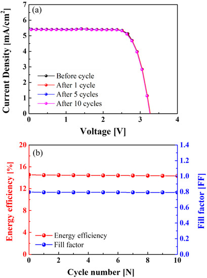 Figure 8a shows the J-V characteristics of the Si solar cells connected to the NCM-LTO full-cell before cycle testing and after 1st, 5th, and 10th cycle tests. The open-circuit voltage (VOC) was 3.37 V before the cycle test, and 3.37, 3.36, and 3.35 V during the 1st, 5th, and 10th cycles, respectively. The short-circuit photocurrent density (JSC) has remained constant with increasing cycle numbers. The JSC was 5.42 mA/cm2 before the cycle test, and 5.42, 5.41, and 5.4 mA/cm2, during the 1st, 5th, and 10th cycles, respectively. Figure 8b shows the energy efficiency and fill factor (FF) of the Si solar cells connected to the NCM-LTO full-cell before and after various cycle tests. Before cycle testing, the fill factor (FF) was 0.796. Then, the FF was 0.793, 0.793, and 0.792 at the 1st, 5th, and 10th cycles, respectively. These results show that the FFs were almost unchanged during the test. The efficiency was 14.54% before the cycle test, and after the 1st, 5th, and 10th cycle tests, it slightly reduced to 14.48%, 14.42%, and 14.35%, respectively. The energy conversion efficiency of the Si solar cells connected to the NCM-LTO full-cell was 98.69% before and after 10 cycles. Therefore, the Si solar cells were suitable as a device for supplying power to the high-performance NCM-LTO full-cell and can pave the way to futuristic energy-saving technologies.