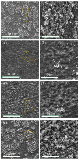 Based on the aforementioned results, we found that temperature variation had a strong sensitivity to the growth of alumina, as shown in Figure 1. The growth of the larger α-Al2O3 particles shown in Figure 2b compared to those shown in Figure 2d showed that stepped heating in an air atmosphere accelerated the growth of α-Al2O3 crystal particles and that the larger particles reduced the density of the surface oxide scale of the alloy to an extent and also reduced the oxidation resistance of the alloy. Previous studies have shown that the minimum temperature at which the θ-Al2O3 crystalline form starts to transform into α-Al2O3 in an air environment is 600 °C, while alumina is present in various mixed crystalline forms in the range of 600–950 °C. At 950–1100 °C, alumina transforms into α-Al2O3 at a faster rate [21,22]; therefore, most of the alumina on the alloy in the air atmosphere was present in the form of α-Al2O3. Stepped heating reduced the transformation rate of Al2O3 in the alloy owing to the relatively slow temperature increase compared to constant heating; therefore, both α-Al2O3 and θ-Al2O3 were present in the alloy and the oxidation resistance of the alloy was decreased owing to the formation of mixed-phase alumina. In contrast, in a water vapor atmosphere, the alumina was mostly in a θ-Al2O3 structure, as confirmed in Figure 2f,h. Therefore, stepped heating in the water vapor atmosphere caused the grain scale of θ-Al2O3 to be significantly smaller than that caused by constant heating. The smaller particle size led to a dense arrangement of alumina on the surface layer of the alloy, which reduced the generation of void and cracks.