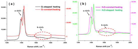 The Raman spectra that were obtained for the NiCrAlHf bond coat alloys in different environments are shown in Figure 4. The peak shifts were predominantly attributed to the large residual internal stresses that were generated inside the alloy at high temperatures. The alumina phase could be determined from the luminescence of Cr3+ and the transition from sub-stable to stable alumina at a very early stage has been investigated extensively [18,19]. Tolpygo et al. [20] determined the approximate locations of the α-Al2O3 and θ-Al2O3 peaks. The alloy mainly produced α-Al2O3 and θ-Al2O3 when using different heating methods and atmospheres. The θ-Al2O3 peak was more obvious in the water vapor atmosphere, which indicated a high θ-Al2O3 content and was also consistent with the conclusion that was derived from the surface morphologies of the alloy. In addition, the Raman peak shifted significantly in the environment of water vapor and constant heating, which indicated that the alloy was subjected to a large residual internal stress. Furthermore, the Raman peak also shifted to an extent in the air and stepped heating environment, which indicated that these environments increased the stress generation in the alloy compared to constant heating.