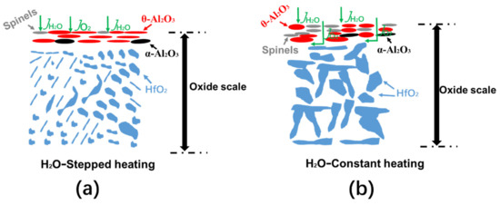 Furthermore, the distribution of HfO2 varied with the different environments and heating methods. In an air atmosphere, stepped heating accelerated the segregation of Hf in the oxide scale and the formation of oxides with O [27]. A portion of singlet Hf also diffused into the alloy along the grain boundaries and increased the bond strength of the oxide scale. Constant heating caused HfO2 to form a dense diffusion barrier in the middle of the oxide scale, which hindered the entry of O [28]. In addition, Hf promoted the bidirectional diffusion of Al and improved the density of the oxide scale. In a water vapor atmosphere, Ni reacted with O to form NiO and Ni also reacted with Al2O3 to form undesirable spinel (NiAl2O4) and reduced the oxidation resistance of the alloy, which could also be confirmed by XRD. Previous studies have shown that Cr in the alloy forms Cr2O3 with volatile properties, which provides a channel for the diffusion of O. The volatility of Cr in water vapor environments has also been extensively studied [29,30]. The diffusion of O was significantly faster in the water vapor atmosphere than in the air atmosphere, mainly because H2O produces H+ and OH− ions through decomposition. H+ increases the vacancy concentration in the oxide scale and accelerates the internal diffusion of cations [31,32]. Metal ions can then diffuse into the interior of the alloy with vacancy concentration at the grain boundaries and are accompanied by a certain degree of internal oxidation, which accelerates the growth of oxide scale.